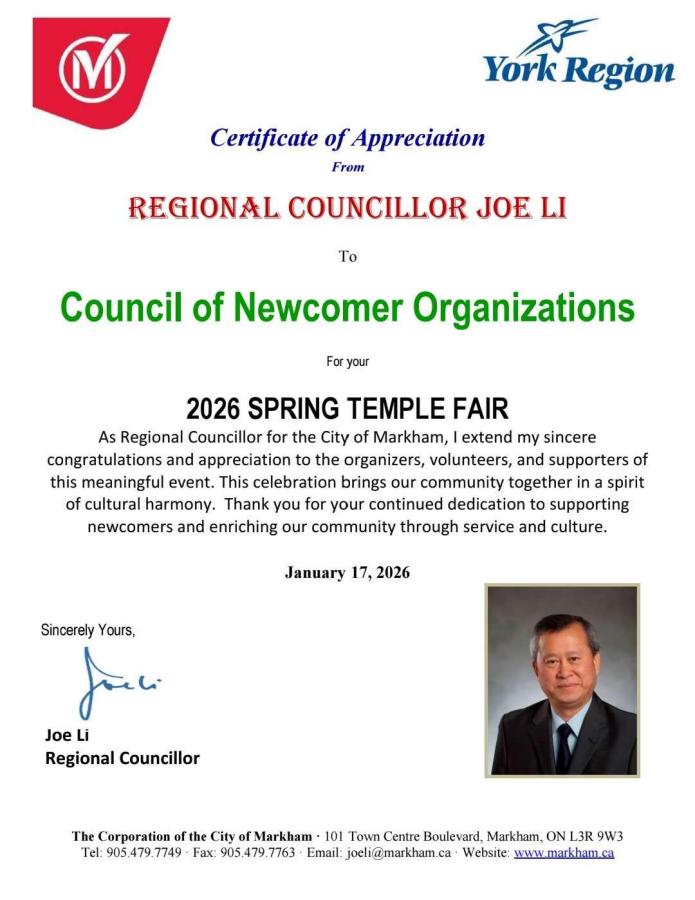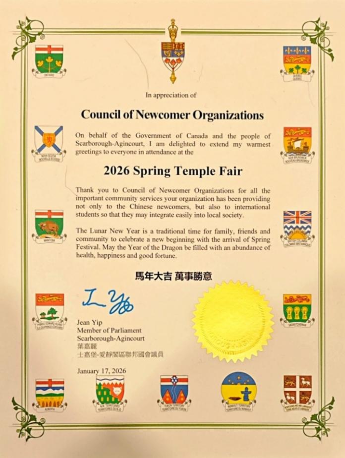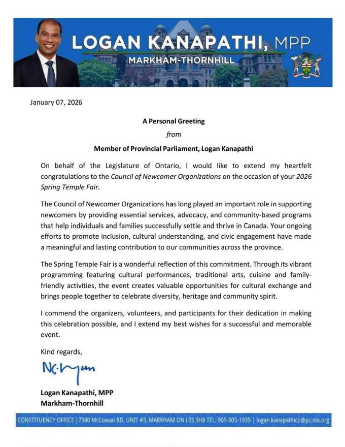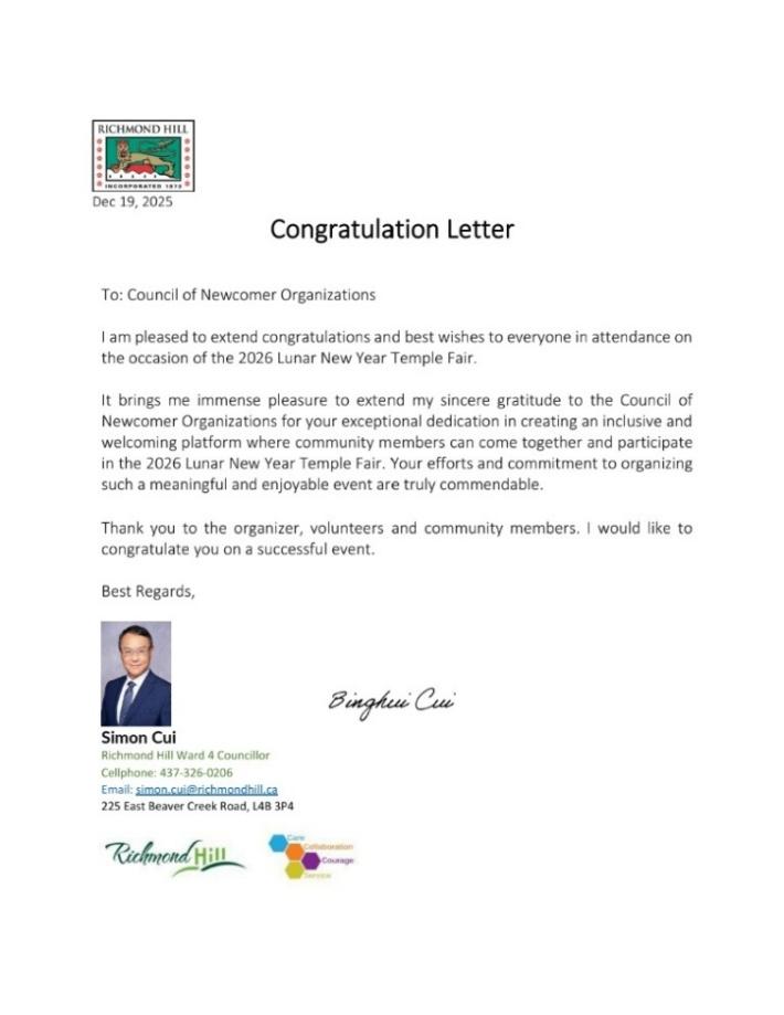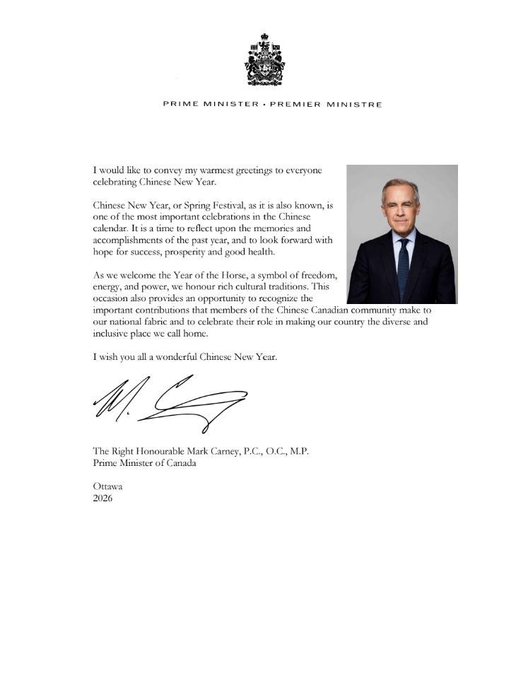 本次庙会得到了社会各界的广泛关注与鼎力支持。加拿大总理马克·卡尼发来贺信,他在信中表示,在马年即将来到之际,华裔社区对加拿大社会做出了重要的贡献,他表彰华裔为加拿大多元而包容之地所发挥的作用。