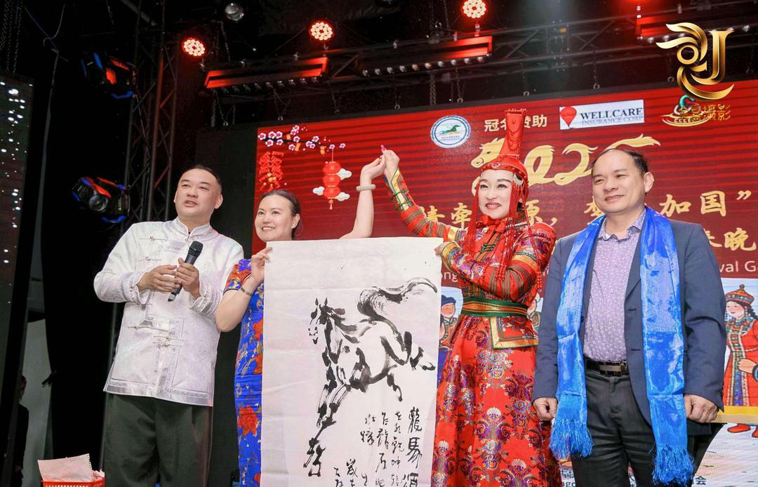 中国著名书画家余岸声现场挥毫创作骏马图《龙马颂》并作为新春贺礼隆重赠送内蒙古协会,为晚会增添浓厚的艺术气息。