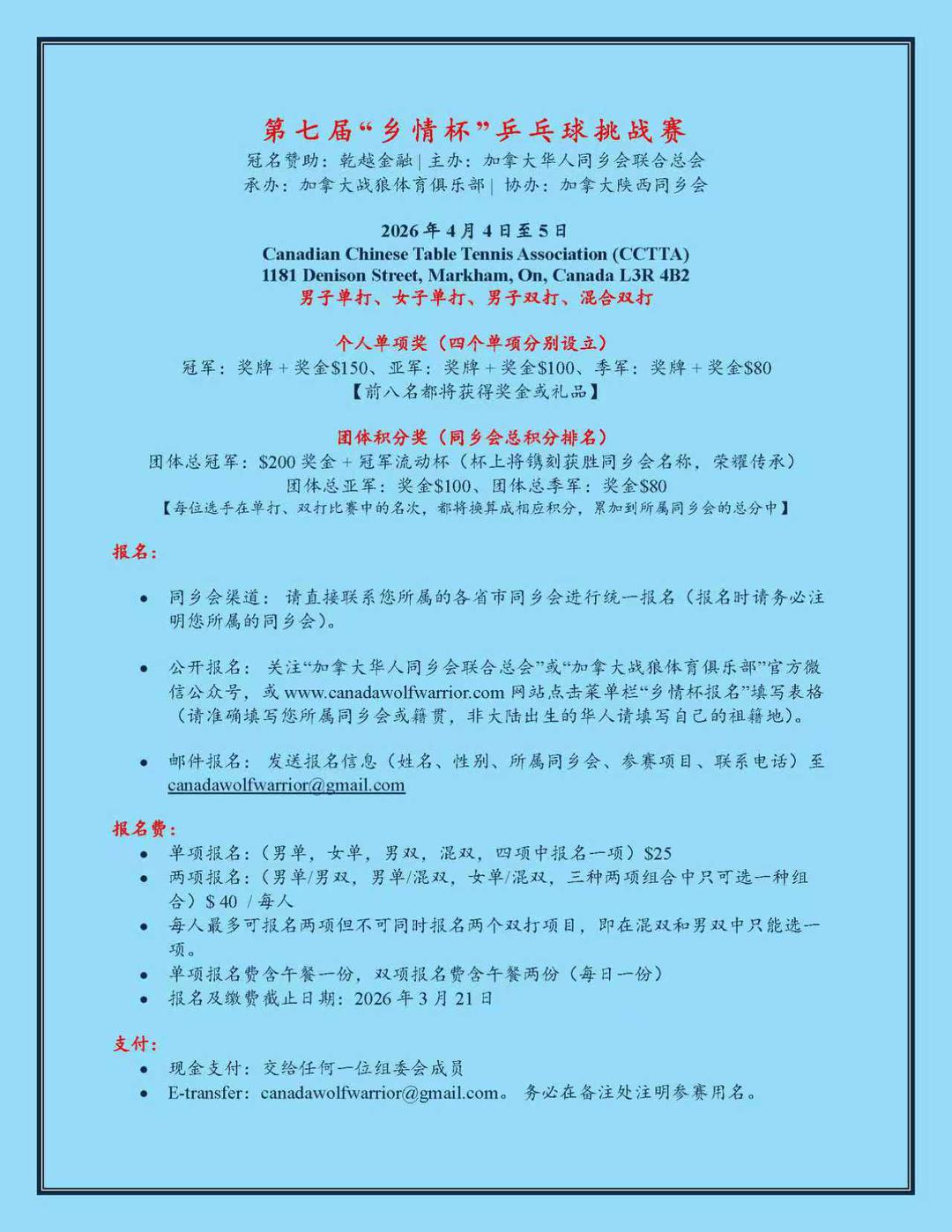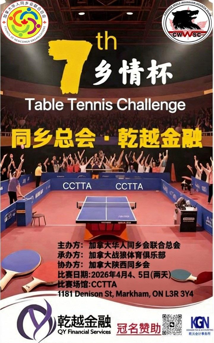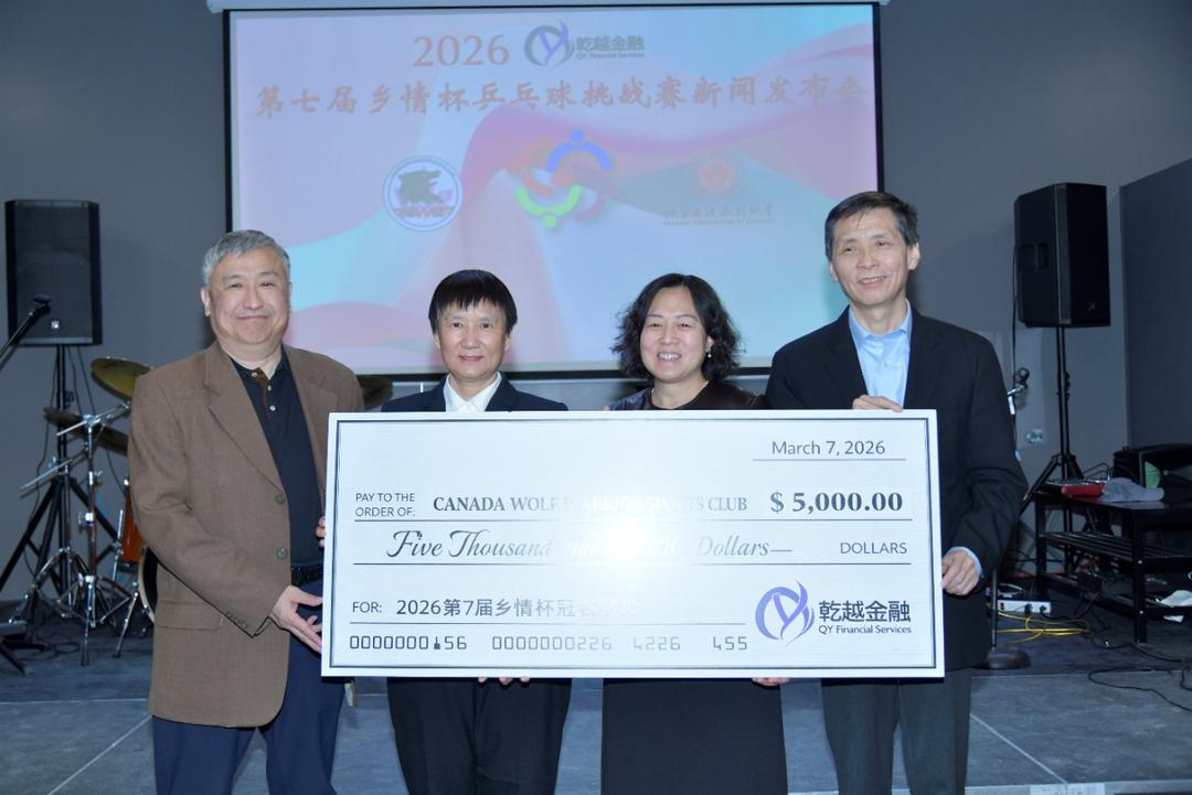 2026年3月7日,多伦多春回大地,暖风习习。由加拿大华人同乡会联合总会主办、加拿大战狼体育俱乐部承办、加拿大陕西同乡会协办的2026“乾越金融”第七届“乡情杯”乒乓球挑战赛新闻发布会在各界嘉宾的共同见证下圆满举行。