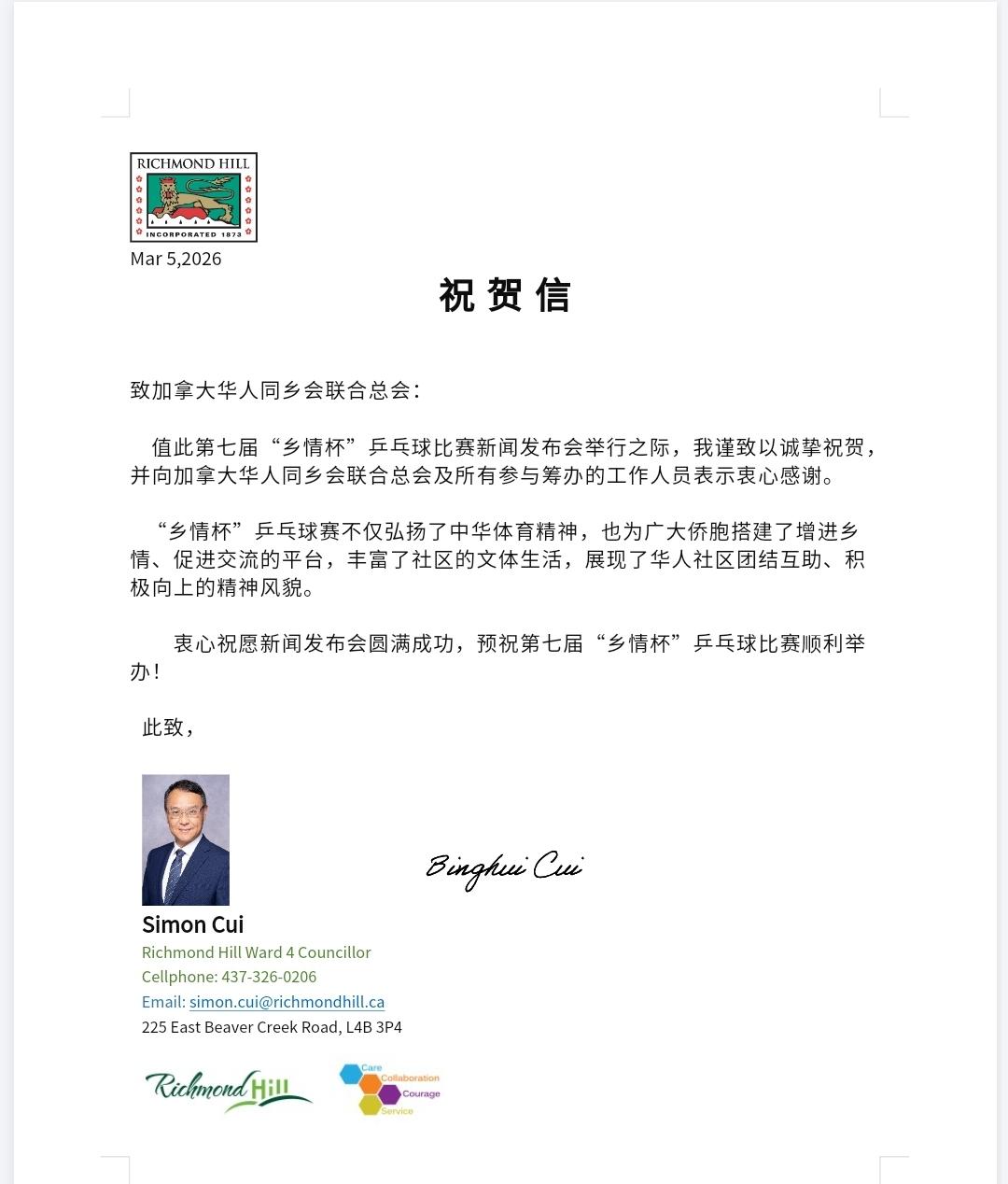 此外,列治文山市议员崔冰辉先生也专门为本次发布会发来贺信,对即将举行的赛事寄予美好祝愿。